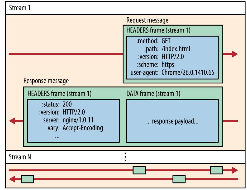 在通信过程中,只会有一个 TCP 连接存在,它承载了任意数量的双向数据流(Stream)。一个数据流都有一个唯一标识符和可选的优先级信息,用于承载双向信息。消息(Message)是与逻辑请求或响应消息对应的完整的一系列帧。帧(Fram)是最小的通信单位,来自不同数据流的帧可以交错发送,然后再根据每个帧头的数据流标识符重新组装。