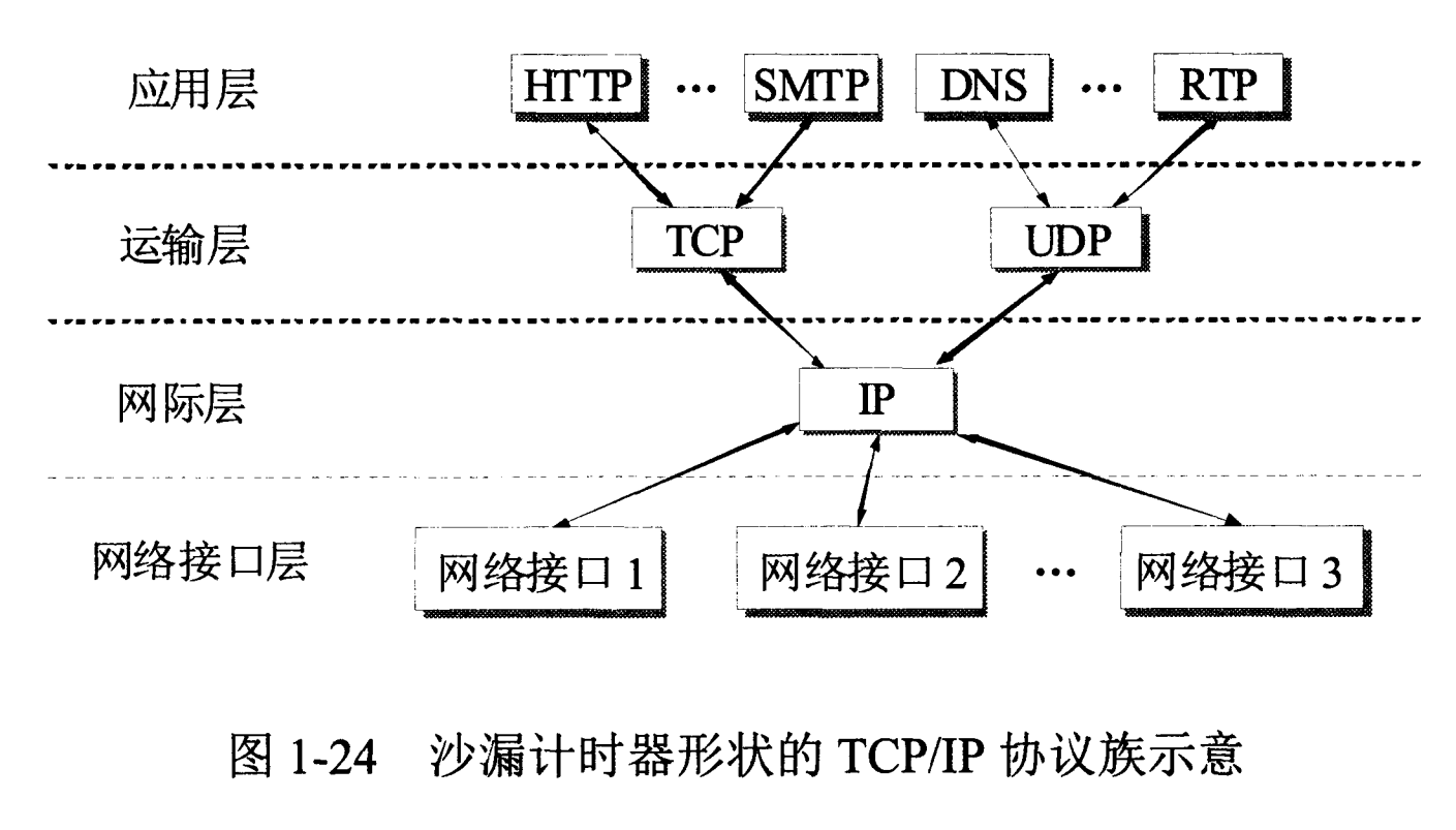 TCP/IP 协议族是一种沙漏形状,中间小两边大,IP 协议在其中占用举足轻重的地位。