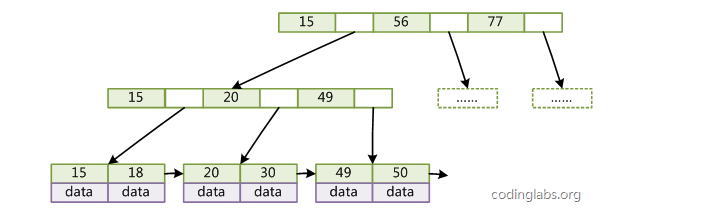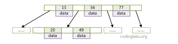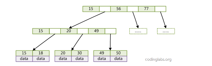 查找算法:首先在根节点进行二分查找,如果找到则返回对应节点的 data,否则在相应区间的指针指向的节点递归进行查找。