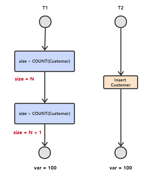 T1 读取某个范围的数据,T2 在这个范围内插入新的数据,T1 再次读取这个范围的数据,此时读取的结果和和第一次读取的结果不同。