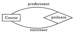 一个实体在联系出现几次,就要用几条线连接。下图表示一个课程的先修关系,先修关系出现两个 Course 实体,第一个是先修课程,后一个是后修课程,因此需要用两条线来表示这种关系。