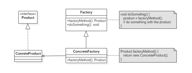 下图中,Factory 有一个 doSomething() 方法,这个方法需要用到一个产品对象,这个产品对象由 factoryMethod() 方法创建。该方法是抽象的,需要由子类去实现。