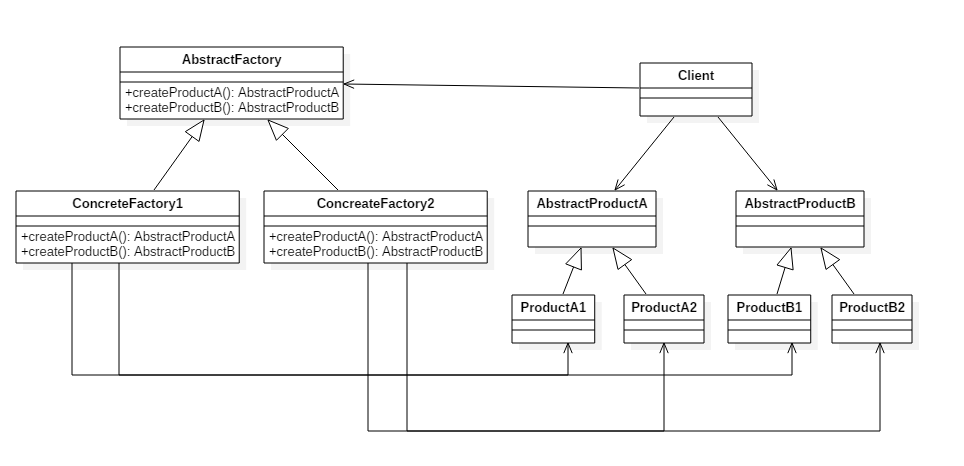 至于创建对象的家族这一概念是在 Client 体现,Client 要通过 AbstractFactory 同时调用两个方法来创建出两个对象,在这里这两个对象就有很大的相关性,Client 需要同时创建出这两个对象。