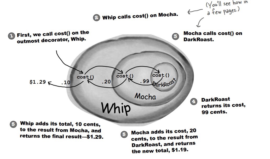 下图表示在 DarkRoast 饮料上新增新添加 Mocha 配料,之后又添加了 Whip 配料。DarkRoast 被 Mocha 包裹,Mocha 又被 Whip 包裹。它们都继承自相同父类,都有 cost() 方法,外层类的 cost() 方法调用了内层类的 cost() 方法。