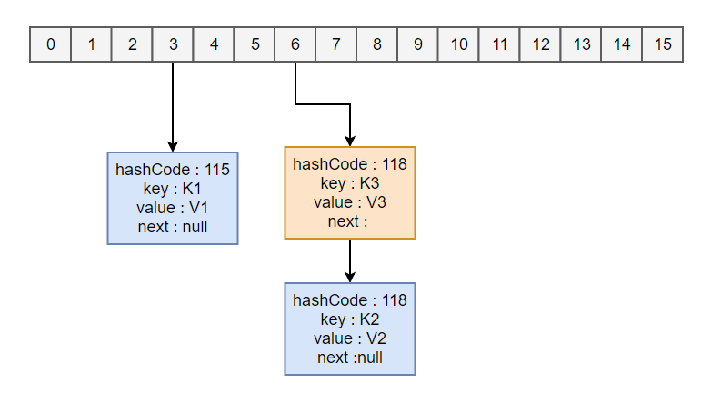 - 插入 <K3,V3> 键值对,先计算 K3 的 hashCode 为 118,使用除留余数法得到所在的桶下标 118%16=6,插在 <K2,V2> 前面。