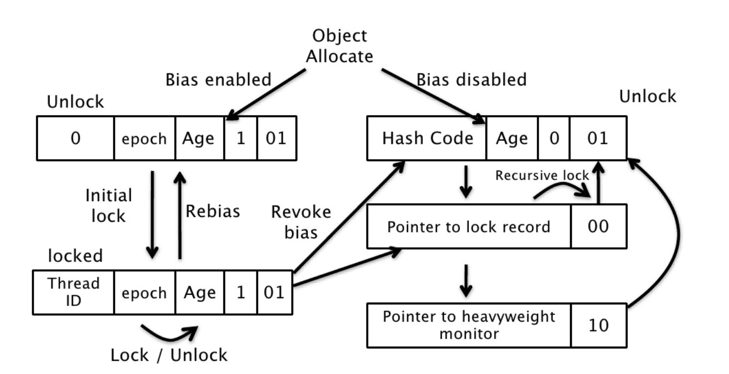 JDK 1.6 引入了偏向锁和轻量级锁,从而让锁拥有了四个状态:无锁状态(unlocked)、偏向锁状态(biasble)、轻量级锁状态(lightweight locked)和重量级锁状态(inflated)。