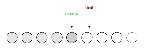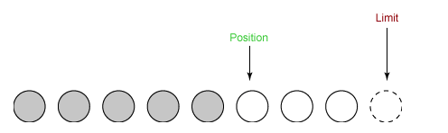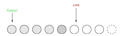 ① 新建一个大小为 8 个字节的缓冲区,此时 position 为 0,而 limit = capacity = 8。capacity 变量不会改变,下面的讨论会忽略它。